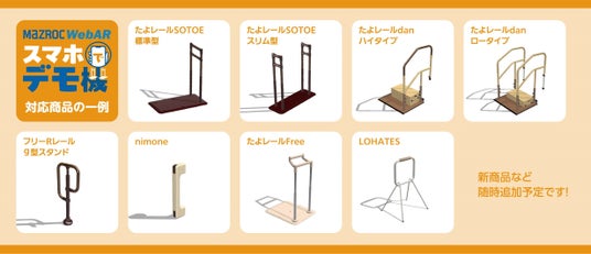 レンタル用手すり「たよレール」シリーズに加えて、「フリーRレールg型スタンド」「nimone」など介護保険の住宅改修費支給対象となるアイテムもAR対応商品にラインナップしています。