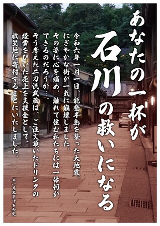 SUNZ dining 株式会社が運営する「牛すじホルモン二刀流武蔵(大阪・本町)」は、今回の地震被害に対し、被災地支援企画として、ディナータイムにご注文いただいたドリンクの売上から提供コストを差し引いた金額を被災地へ寄付することを決定いたしました。