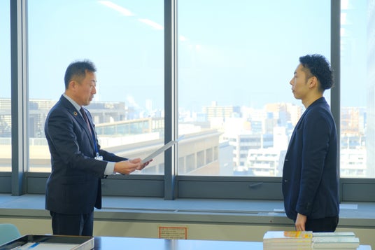 寄贈を受け取る堺市教育委員会事務局 学校教育部長 富岡樣(左)と(株)ArtBiz代表 大河内薫(右)