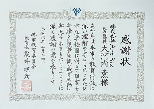 このたびは堺市の学校に通う子供たちのために「お金の本」を寄付させていただきました。