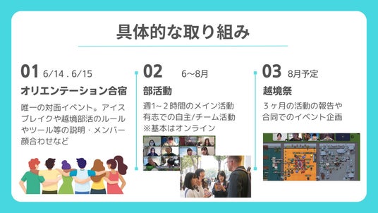 留学経験を持ち、多様な才能を持つセンパイ顧問と全国の高校生がチームを組み、対面合宿+オンライン+“越境祭”を3ヵ月かけて実施します。自分の興味や関心に沿って部活動を行うことで、興味のあったものを「体感」したり、さらに深く「探究」します。学校だけで完結せず、越境することによって、今までにはない、ニッチな部活を実現します。 ※本プロジェクトは、三菱みらい育成財団に採択されたNPO法人leap for と一般社団法人ウィルドアによる共同事業です。
