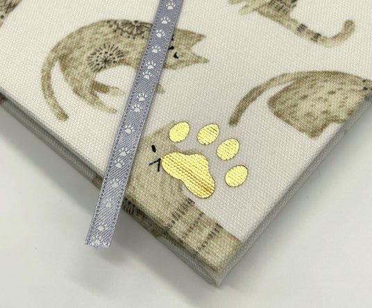 表紙にゴールド肉球の箔押し、しおりにも肉球プリントが。