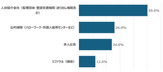 次に、「公的機関(ハローワーク・外国人雇用センターなど)」が26.0%、「求人広告」が24.0%となっており、比較的一般的な募集方法を通じた採用も一定数行われています。
