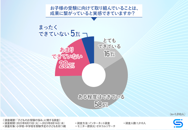 「お子様の受験に向けて取り組んでいることは、成果につながっていると実感できていますか?」と質問したところ、『まったくできていない(5.1%)』『あまりできていない(20.2%)』『とてもできている(16.1%)』とおよそ4人に1人の方が、成果につながっていないと感じていることがわかりました。