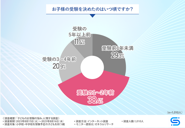 「お子様の受験を決めたのはいつ頃ですか?」と質問したところ、『受験の1~2年前(38.4%)』と回答した方が最も多く、次いで『受験前1年未満(29.3%)』『受験の3~4年前(20.9%)』『受験の5年以上前(11.4%)』と続きました。