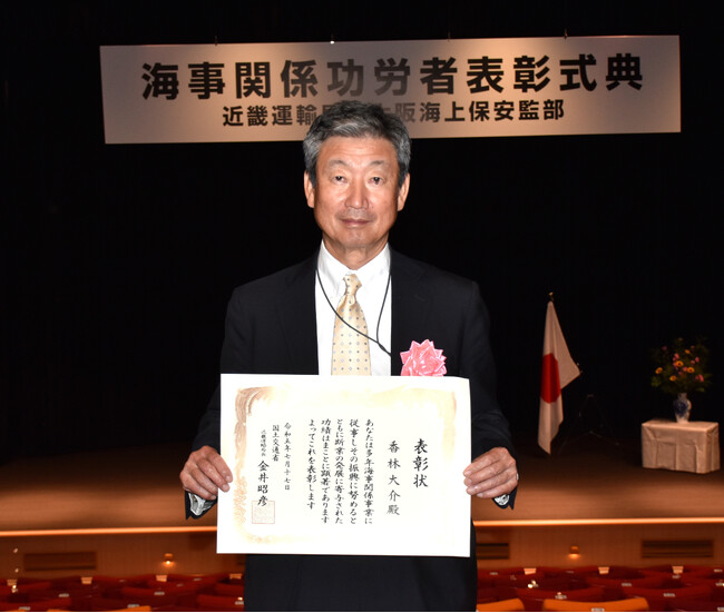 令和5年「海の日」海事関係功労者表彰の表彰式が7月20日に開催され、当社専務取締役の香林 大介(こうりん だいすけ)が海事関係功労者(事業功労)として近畿運輸局長表彰を受賞しました。