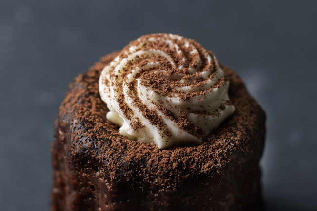 デコレーションに使用されている練乳入りチョコレートクリームは舌触りがなめらかで、ココアの優しい甘さと絶妙にマッチします。見た目にも上品な「ティラミスカヌレ」は、一つひとつ職人が手作りで作り上げる、至福の香り高い仕上がりです。