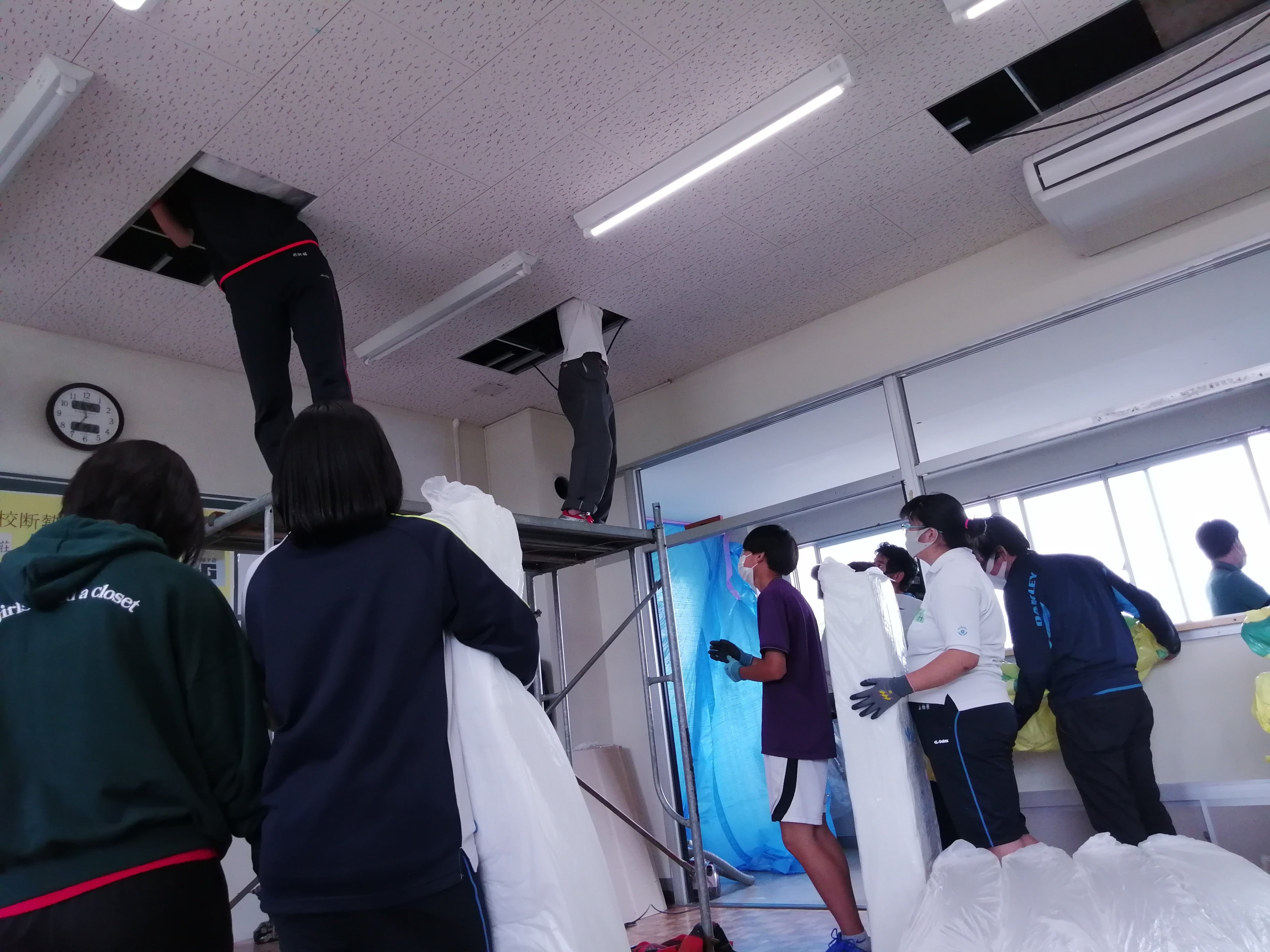 天井裏に断熱材を敷き込む白馬高校の生徒たち