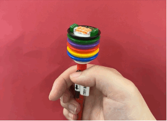ボールペンのクリップ部分をノックすると、ボールペン上部のお皿に乗っている小さなお寿司がくるっと回転します。その様はまさに“回転”寿司。お寿司のネタは、人気のマグロ、サーモン、エビ、イクラの4種類で、お寿司が消えた後のお皿には、醤油とわさびや、リアルさにこだわったエビのしっぽやイクラの粒等が残ります。シャリの部分も、お米の粒まで細かく表現しています。