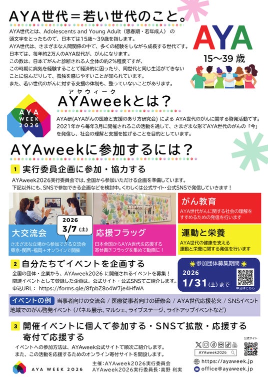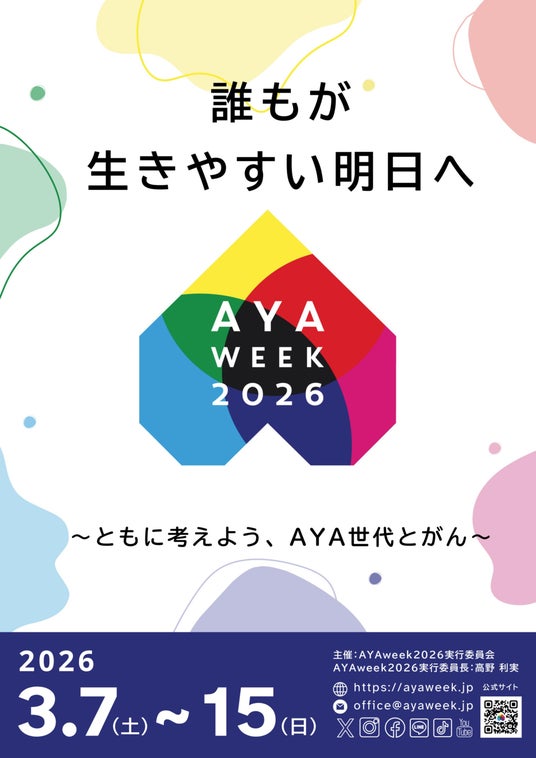 AYA世代がんの医療や支援に取り組むステークホルダーでつくるAYAweek2026実行委員会は、来る3月、AYA世代がんの社会啓発週間として「AYAweek2026」(3月7日~15日)を開催します!