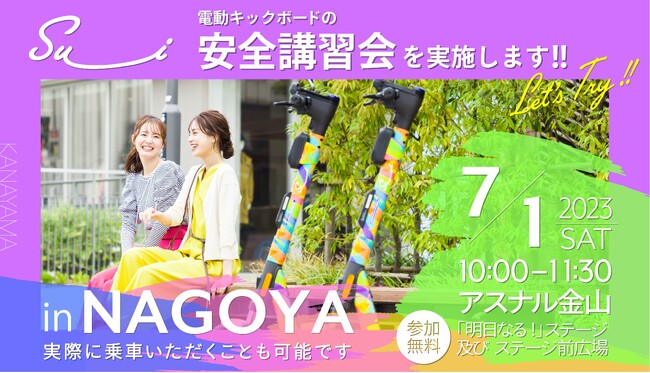 電動キックボードシェアリングサービス「Su__i(スーイ)」を展開するCrystal株式会社(本社:愛知県名古屋市西区、代表取締役社長:蒼佐ファビオ、以下「Su__i」)は、2023年7月1日(土)10時より、名古屋市アスナル金山「明日なる!」ステージ及びステージ前広場にて、愛知県警・中警察署交通課と連携し、電動キックボードの安全講習会を開催します。