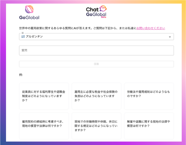 このAIチャットボット「ChatGoGlobal(チャット ゴーグローバル)」は、GoGlobalが独自に持つ100カ国以上のグローバルHR情報データベースを元に、生成AI技術を組み合わせ、海外進出時に確認したい対象国の法規制や、グローバルな人事手当、国別の雇用規制、従業員契約などに関連する幅広い質問に対して、数秒以内に適切な回答をご提供することができるように設計されている画期的なサービスです。 GoGlobalはグローバルHR情報のAI搭載チャットボットを提供する最初の国際的なEmployer of Record(EOR)サービス会社となります。