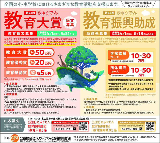 2024年4月1日より募集を開始する「第24回ちゅうでん教育振興助成(締切6/13)」および「第23回ちゅうでん教育大賞(論文)(締切5/31)」の応募概要を紹介します