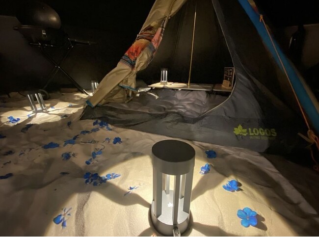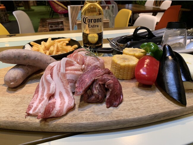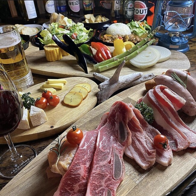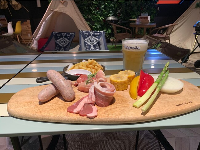 内装の壁にはスギの木をあしらっており自然の木の香りも漂う。本格アウトドアグッズで揃えられた椅子、テーブルやグリルで都会のど真ん中で「映える」BBQが楽しめます。