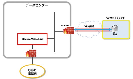 PBXがAWSやAzureのようなパブリッククラウド上に構築されている場合は、「Secure Voice Line」との間をVPNによるセキュアな暗号化接続に対応します。