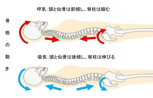 呼気:仙骨前傾 → 横隔膜上昇 → 胸郭が狭まり空気を排出 吸気:仙骨後傾 → 横隔膜下降 → 胸郭が広がり空気を取り込みやすい