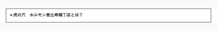 関西地方では、ホルモンの言語は放るもの(捨てるもの)にあるという俗説もありますが、黒毛和牛のホルモンをソンマシイッタの精神を通じて、お客様に頬が落ちるような”幸せ”な体験をして頂きたい。人と料理とお酒、様々な出会いと新しい体験に溢れる恵比寿横丁の地に、虎の穴ホルモンはヒト・モノ・クウカンを通じて”幸せ”な時間を提供し続けてまいります。