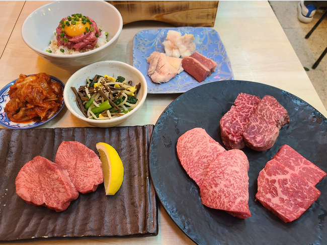 ワンランク上の上質な和牛ハラミ、ロース、カルビに加え、厚切りタン元とホルモン3種類と名物のユッケ丼が締めくくる贅沢な組み合わせをお値打ち価格で楽しめます。