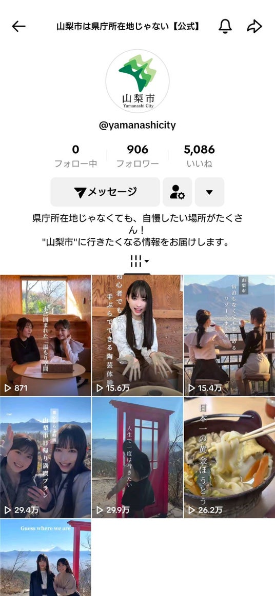 山梨県山梨市では、令和7年1月よりTikTokによる市の魅力発信を始めました。