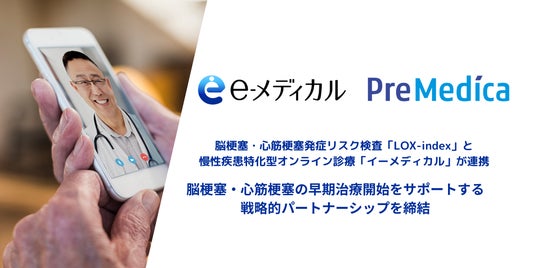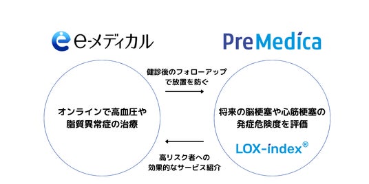 本パートナーシップでは、動脈硬化の原因物質を測定し、将来の脳梗塞・心筋梗塞の発症リスクを評価する血液検査サービス「LOX-index(R)(ロックス・インデックス)」と、イーメディカルジャパンが提供する慢性疾患特化型オンライン診療サービス「イーメディカル」を活用します。LOX-index(R)の受診者のうち、動脈硬化リスクが高く、その主要因が高血圧・脂質異常症である方に対してイーメディカルを紹介し、検査後のフォローアップを効果的に行うことができるようになります。