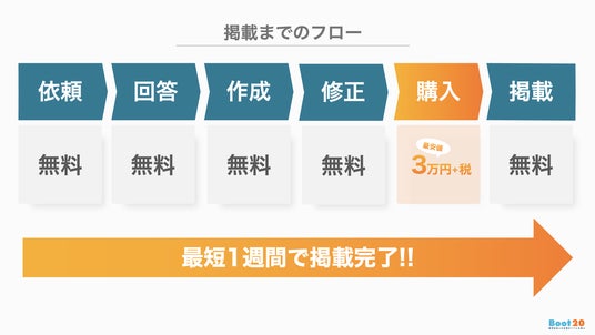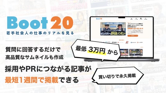 Boot株式会社(本社:京都府京都市下京区 代表:三谷 憩 以下、当社)は、若手社会人の仕事のリアルを見るビジネスメディア「Boot20」(以下、Boot20)において、企業の採用・PRに繋がる記事作成サービスの新プラン(以下、本プラン)を公開しました。質問に回答するだけで、プロフェッショナルな記事の掲載を3万円からご利用いただけます。