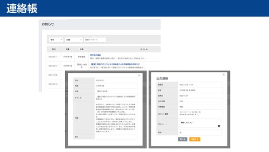さらに、タイムライン形式の「通信」を作成することもできます。学校通信・学級通信のように、写真やコメントを投稿することで学校の様子を保護者や生徒に伝えることができます。