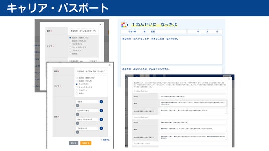 キャリア・パスポートをクラウド上で作成、管理する機能です。年度初め、各学期末、行事ごとの目標や振り返りを記録することができます。質問はフォーム形式で作成、児童生徒が入力することで完了します。先生や保護者からのコメントも、オンラインで入力することができるので、印刷、配付、回収などの手間を削減します。