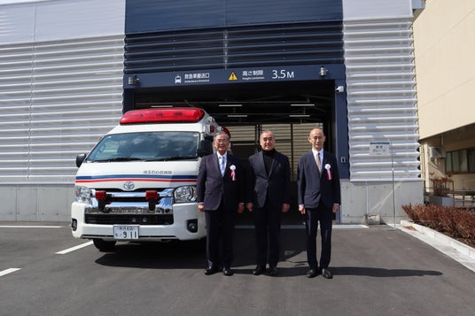 新棟の救急ガレージ前にて(左より:社会医療法人財団石心会・杉山孝博理事長、小谷野剛狭山市長、石井耕士病院長)