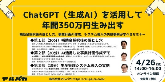 関西発のスタートアップ、株式会社アルパカ(大阪市梅田) は、中小企業診断士の鈴木氏と補助金獲得、DX化、残業削減して年間350万円生み出す共催セミナーを4月26日に開催します。参加費は無料です。