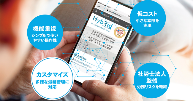 「HybRid」は、業務とコストの大幅な削減、ペーパーレス化による工数の圧倒的な削減、低コストでの導入、そして社労士法人の監修による信頼性を特長とする労務管理ツールです。