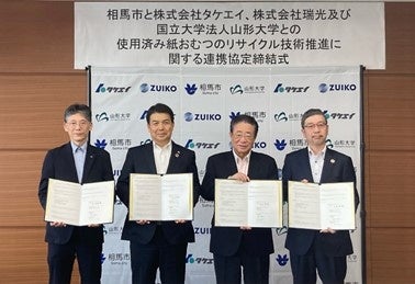 2024年5月27日に、相馬市(以下「相馬市」)、株式会社タケエイ(東京都港区、以下「タケエイ」)、株式会社瑞光(大阪府茨木市、以下「瑞光」)及び国立大学法人山形大学(山形県山形市、以下「山形大学」)との間で、「使用済紙おむつのリサイクル技術推進に関する連携協定」( 以下「当協定」)を締結し調印式を行いましたので、お知らせいたします。