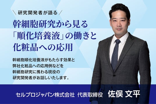 最先端の研究機関で細胞研究を続ける現役研究者でありながらバイオベンチャー企業の代表を務める佐俣文平が、各種イベントで好評のセミナーをオンラインにて開催。「順化培養液」「エクソソーム」といった幹細胞由来成分の働きと、順化培養液(原料)としてどのように化粧品に応用できるのか、アカデミアでの研究歴15年の現役幹細胞研究者が専門的視点から解説します。