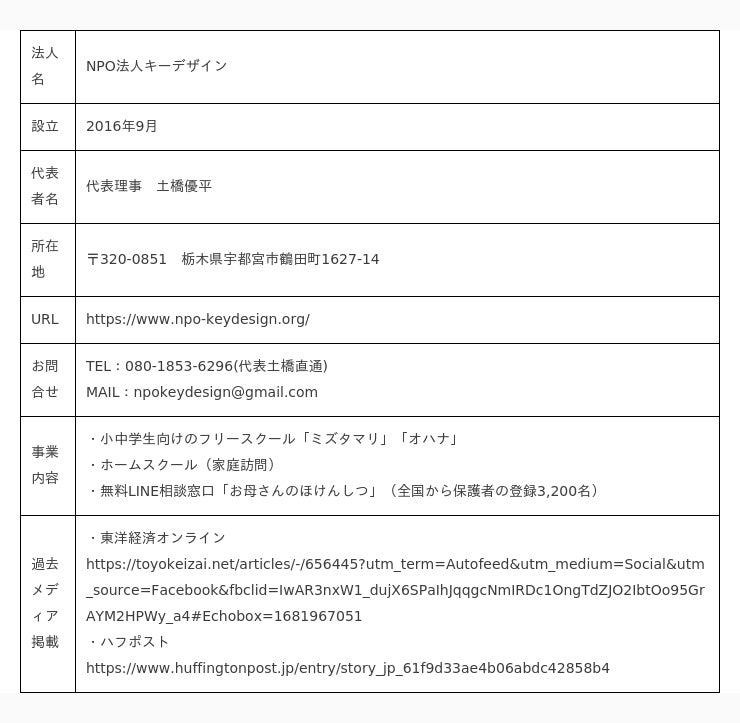NPO法人キーデザイン(栃木県宇都宮市)が運営する、不登校の子ども向けの居場所などを掲載したポータルサイト”たより”。保護者の方の「学校以外に子どもが行ける場所を知らない」という声に応えます。