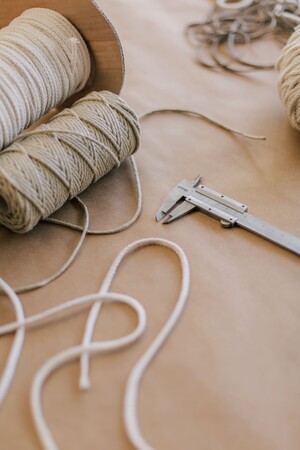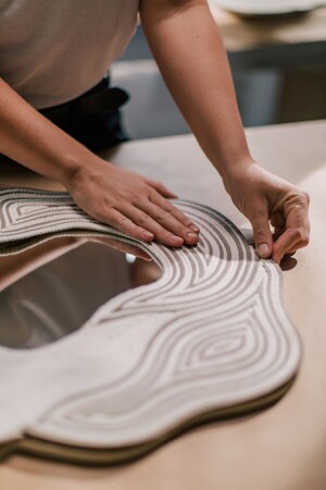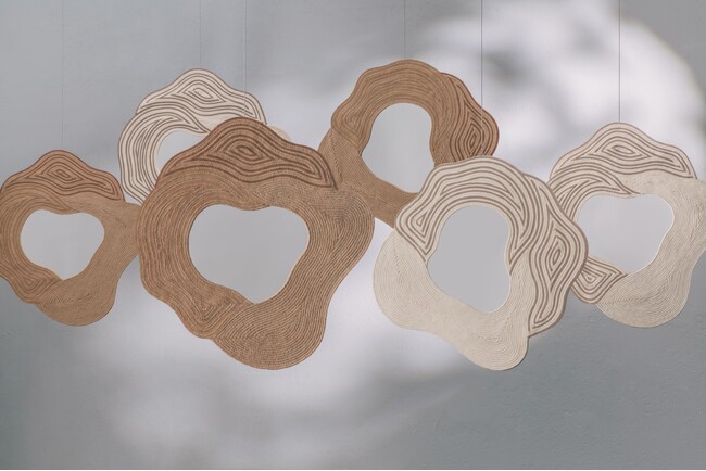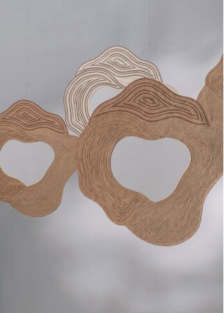 素材とイノベーション素材への創意工夫に富んだ探求者Wendy Andreu(ウェンディ・アンドリュー)は10年ほど前に、素材を組み合わせるために縫ったり編んだりする代わりに、シリコンコーティングを用いる方法を開発しました。彼女が革にシリコンを使うのは今回が初めてです。デザイナーは木製サポートの上にコットンコードと革の端切れを渦巻き状に置いていきます。シリコンで全体をコーティングして、シリコンが乾いてからそれぞれのミラーを型から外します。
