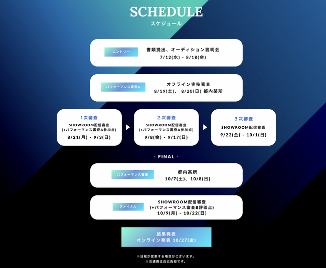 ・8/19(土)or8/20(日)、10/7(土)or10/8(日)(※進出した場合)の都内某所でおこなわれるオフラインパフォーマンス審査にご参加可能な方