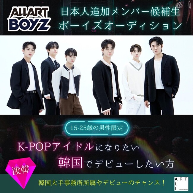 株式会社CUEIGHT(東京都渋谷区、代表取締役:永井 連)は、「BOYS PLANET」や「少年ファンタジー」出演経験者を含むメンバーで構成された「ALLART BOYZ」の日本追加メンバー候補生ボーイズオーディション「ALLART BOYZ AUDITION」を開催いたします。最終審査にて選抜された数名がソウル近郊にて開催予定の事務所最終面談にご参加いただいきます。