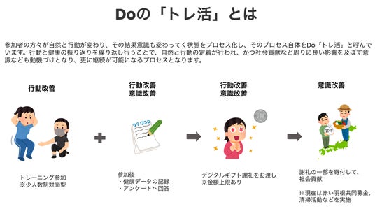 Doは専任トレーナーによる対面型少人数制の運動プログラム(ヨガ、サーキットトレーニング、ランニング)を格安で提供しております。他にもご自宅から参加しやすいように就寝前のオンラインヨガをライブ配信で行っています。参加者様はそれぞれの運動プログラムに参加後、自己申告による健康データ記録とサービスへのアンケート回答を「Do note」というWebアプリ上で行っていただき、運動実施と健康状態をデータで振り返る「トレ活」の習慣化を行っております。