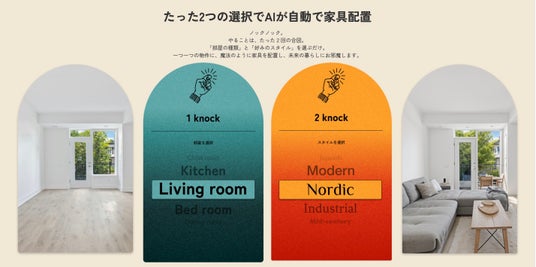 ユーザーは部屋の写真をアップロードした後に「部屋の種類」と「好みのスタイル」を選ぶだけで一つ一つの物件に家具を自動配置、未来の暮らしをイメージすることが可能になっています。