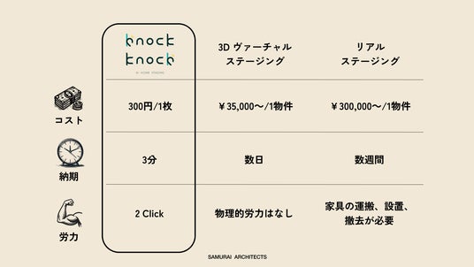 「Create a better place with technology」をミッションとする株式会社SAMURAI ARCHITECTS(本社:東京都、代表取締役:加藤利基、以下SAMURAI ARCHITECTS)は、当社が提供するホームステージングAIサービス「knock knock AI(ノックノックAI)」の正式リリースいたしました。