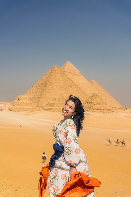 エジプトのピラミッドの前で、高知県の伝統工芸品を片手に舞いました。