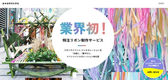 宝本商事株式会社(代表取締役 宝本龍吾、以下当社)は、繊維専門商社として76年にわたり、リボンやファンシーヤーン(意匠糸)、人工羽毛などの機能素材の企画製造販売、ニット製品などのアパレル製品のOEM事業を展開してまいりました。このたび、大規模イベント向けの装飾・特注リボンに特化した新事業をスタートいたしました。当社はこれまでも、大阪御堂筋イルミネーションの樹木ラッピングや八重洲ミッドタウンの1周年記念催事ディスプレイなど、大規模イベントへの特注リボンを提供してまいりました。また、本新規事業を契機に公式WEBサイトをリニューアルいたしました。