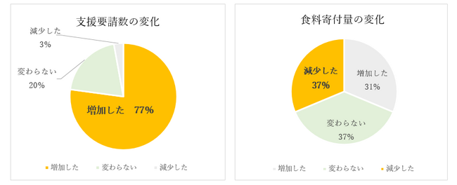 プロジェクト終了後のアンケートに回答した団体のうち、77%の団体が「食料支援の要請件数が増加した」と回答しました。その反面、37%の団体が「食料寄付量が減少した」と回答しています。