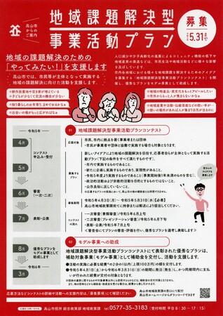 人口減少や少子高齢化によるコミュニティ機能の低下や地域産業の衰退などは、市民生活や地域活動に様々な影響を及ぼしています。高山市では市民等が主体となって実施する地域の課題解決に向けた活動プランのコンテストを行い、優秀なプランをモデル事業として支援(助成)します。