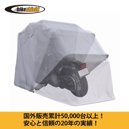 利便性に優れた簡易開閉式バイクガレージ『バイクシールド』。耐錆性のフレームと高耐久カバー素材であなたの大切な愛車を守ります。URL:https://thebikeshield.com/jp/