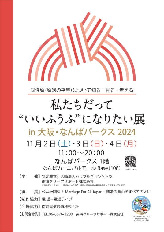 南海グリーフサポート株式会社<南海電気鉄道100%出資>(取締役社長:小池 裕司)は、2023年6月より性的少数者が安心して葬送儀礼を行えるようLGBTQフレンドリーを掲げており、この度、同性婚の法制化(婚姻の平等の実現)に向けて、特定非営利活動法人カラフルブランケッツと共同で2024年11月2日(土)より3日間、なんばパークスに於いて、「私たちだって“いいふうふ”になりたい展in大阪・なんばパークス2024」を開催いたします。この展示会では「同性婚(婚姻の平等)はなぜ必要?」「同性パートナーシップ制度との違いは?」「同性カップルは何に困っている?」という疑問にお答えしますので、どうぞお気軽にお越しください。