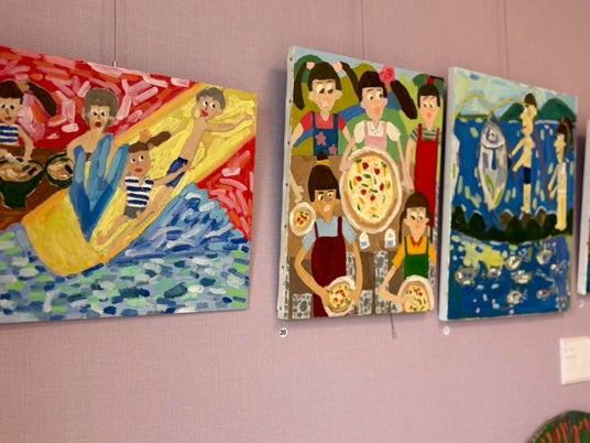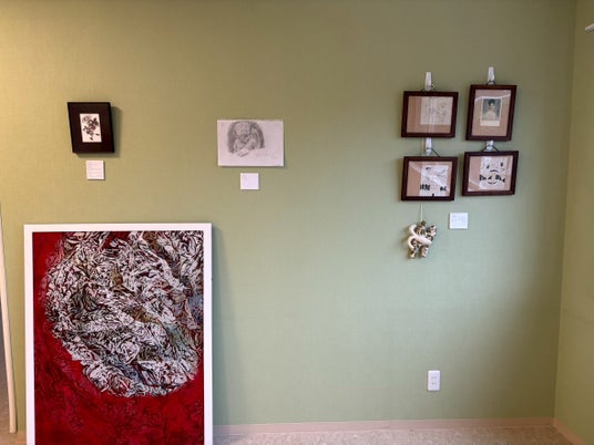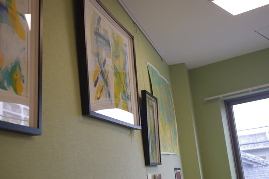 グリーン、ライトブルー、ピンクと多彩な壁に色彩豊かな作品が多数飾られている。