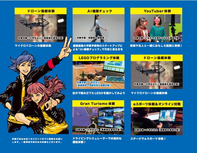 開催内容 LEGOプログラミング、eスポーツ体験、ドローン操縦体験、VR学習体験、YouTuber体験、AI健康チェック など