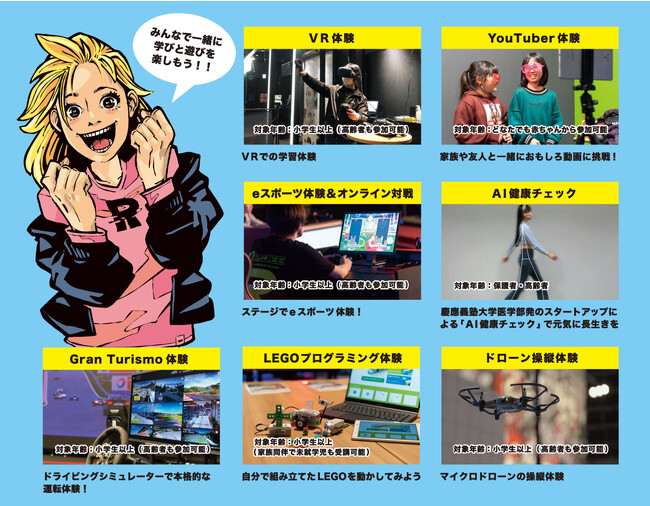 開催内容:LEGOプログラミング、eスポーツ体験、ドローン操縦体験、VR学習体験、YouTuber体験、AI健康チェック など