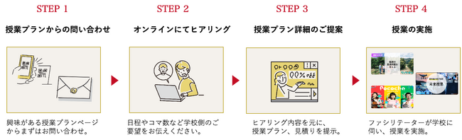 気になる授業の相談から始まり、学校の状況に応じたコマ数や内容の調整、関連企業・団体への連絡、さらにはファシリテーターによる授業の実施までワンストップでサービスを提供いたします。