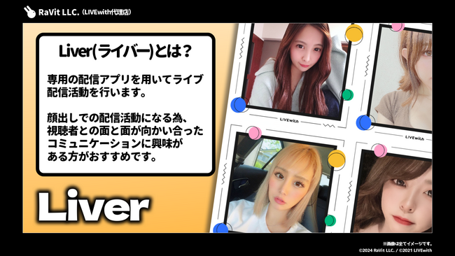 ・本ーディションはLIVEwithの代理店である合同会社RaVitが実施するオーディションです。オーディション合格後は、いずれもLIVEwithへの所属となります。